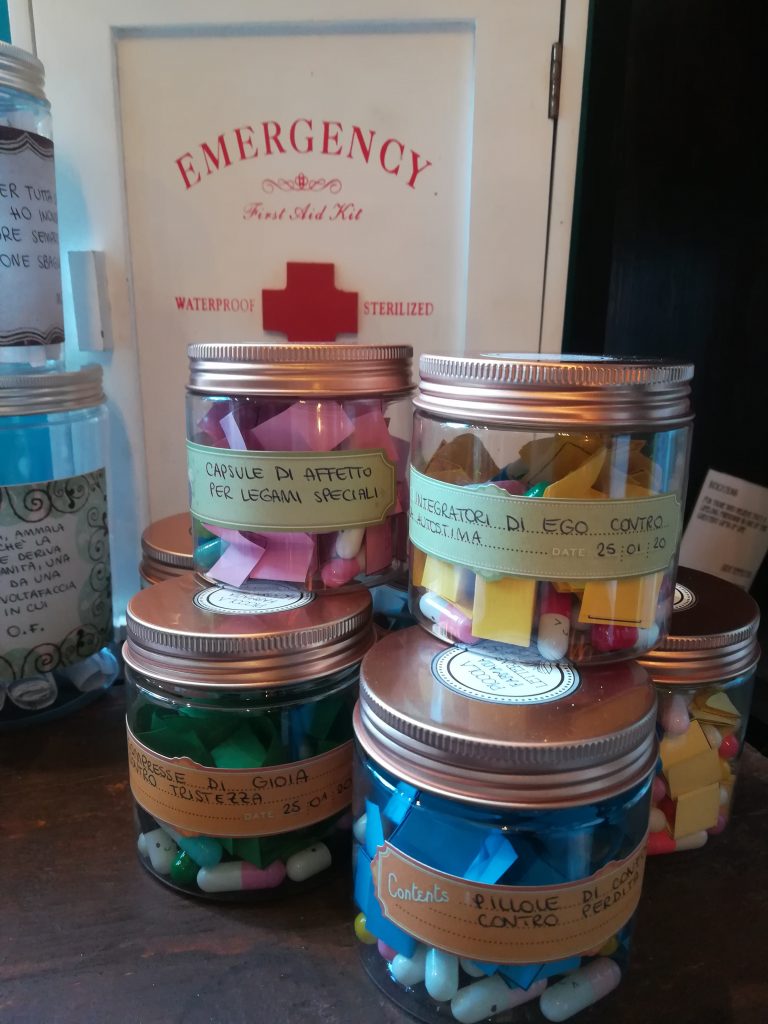 Dal momento in cui ho messo piede all’interno di quei favolosi 35 metri quadri, il mondo per due ore si è fermato (e quando dico due ore, intendo proprio due ore di orologio!). Ho preso in mano la mappa che mi ha aiutata a perdermi all’interno di un universo parallelo, vagando fra gli scaffali che contenevano libri per ogni tipologia di emozione e stato d’animo: tristezza, amicizia, bisogno di autostima, emancipazione, maldamore, depressione, desiderio di cambiamento… Tutti questi sentimenti trovano, all’interno della Piccola Farmacia Letteraria, un farmaco che può essere assunto senza ricetta. I bugiardini, realizzati insieme a psicologhe professioniste, contengono indicazioni terapeutiche, posologia ed effetti collaterali. Io ritengo che l’unico effetto collaterale di questa libreria sia di non poterne più fare a meno!