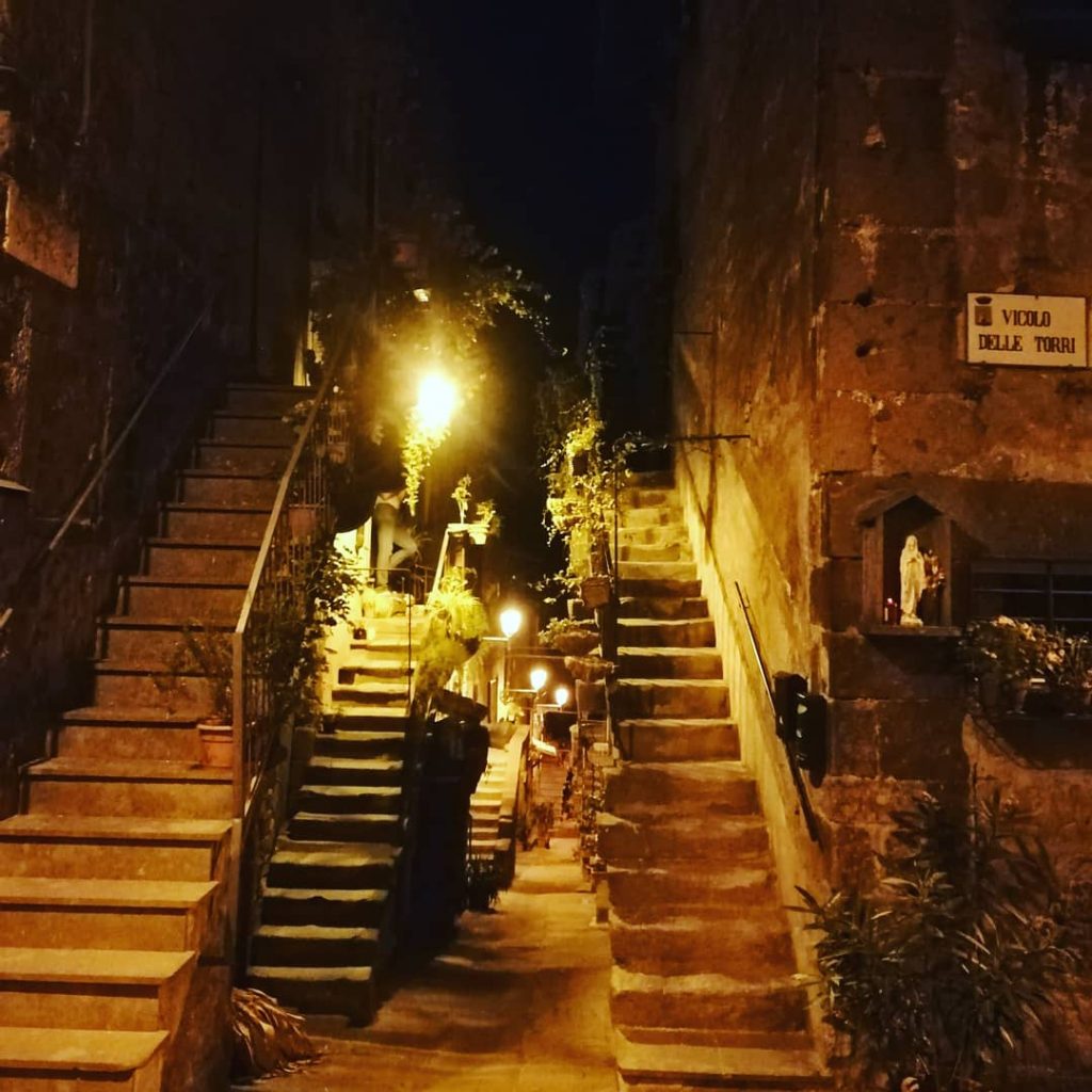 Lasciandoci il mare alle spalle, ci siamo diretti in Lazio, a Vitorchiano. Si trattava di un punto di appoggio per visitare, l’indomani, Bomarzo. In realtà Vitorchiano è stata una piacevole scoperta. Di sera sembra uscito da un film…