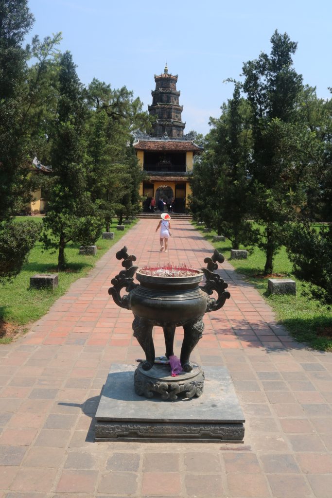 Visita della pagoda Thien Mu (pagoda del Signore Celeste), molto bella e in una splendida posizione sul fiume Huong (fiume dei profumi). La pagoda è circondata da uno splendido giardino di bonsai e alberi di frangipane.