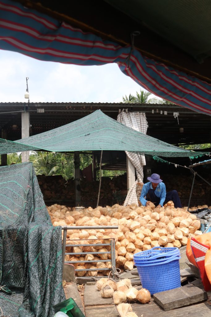 Crociera lungo un affluente del fiume Mekong, nella zona di Ben Tre (regno del cocco); visita, dalla barca, dei luoghi un cui lavorano il cocco, per le attività di commercio.